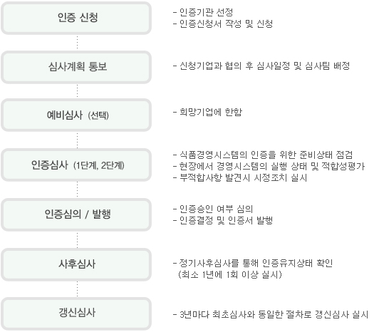 인증의 대상은 식품공습사슬 (Food Supply Chain)에 속하는 기업으로 1차 생산자, 식품 제조자, 포장, 장비, 세척, 첨가물, 운송 및 보관자 , 도소매, 급/ 배식 및 식품 서비스업종의 기업이 인증을 받을 수 있습니다.