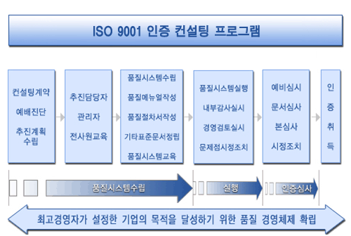 ISO9001 인증은 기업이 운영하고 있는 품질경영시스템이 ISO9001 시리즈 규격의 요구사항에 적합하게 규정되어 있고 실행되고 있음을 국가가 인정하는 인증기관이 보증해주는 제도이다.