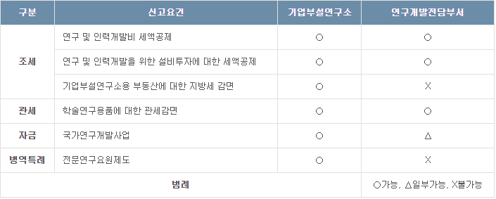 기업부설연구소 / 연구개발전담부서 설립신고제도는 일정요건을 갖춘 연구소와 전담부서를 신고. 인정함으로써 각종 조세, 관세, 자금지원 및 병역특례 등의 혜택을 부여하고 기업의 기술개발을 적극적으로 촉진, 유도하는 동시에 이들 연구조직을 효율적으로 육성. 지원하기 위하여 1981년부터 제정된 제도.