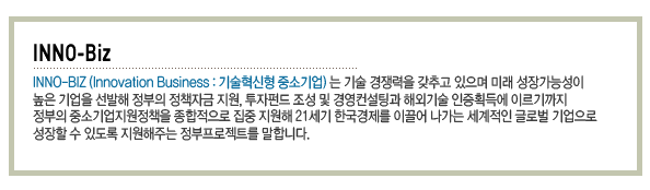 Innovation(혁신)과 Business(기업)의 합성어로 기술 우위를 바탕으로 경쟁력을 확보한 기술혁신형 중소기업을 지칭 합니다 . 연구개발을 통한 기술 경쟁력 및 내실을 기준으로 선정하기에 과거의 실적보다는 미래의 성장성을 중요시 한다는 특징을 가지고 있습니다.