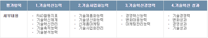 이노비즈 평가는 기술혁신시스템과 개별기술평가로 이루어져 있습니다 . 기술혁신시스템은 기술혁신 능력, 기술사업화능력, 기술혁신경영능력, 기술혁신성과로 나누어져 있으며 온라인 자가진단의 평가가 해당됩니다, 개별기술평가는 권리적인 측면, 경제적인측면, 환경적인측면 구분되어 평가가 이루어집니다.