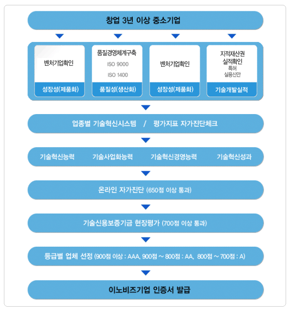 - (4) 현장평가 대상업체 선정되면 기술신용보증기금의 기술평가센터에서 현장평가를 실시합니다. 현장평가에서 실시하는 기술혁신시스템 평가와 개별기술 평가에서 각각 700점과 B등급이상을 받으시면 최종적으로 Inno-Biz에 선정이 됩니다.